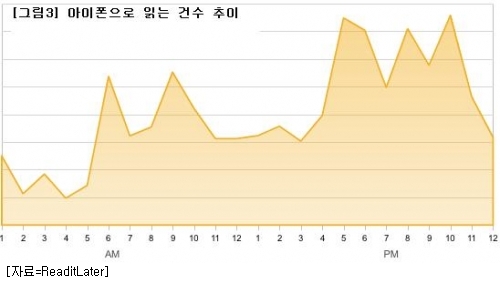 ¡ß¾ÆÀÌÆÐµå, Àú³á ½Ã°£ ÁýÁß µÎµå·¯Á® < ±×¸²3 > Àº ¾ÆÀÌÆù ÀÌ¿ëÀÚµéÀÇ Àб⠰æÇâÀ» ³ªÅ¸³½ ±×·¡ÇÁ´Ù. ¿ÀÀü 6½Ã ÀüÈÄ¿Í 9½Ã ÀüÈÄ. ±×¸®°í ¿ÀÈÄ 5~6½Ã »çÀÌ, ¿ÀÈÄ 8~10½Ã »çÀÌ µî ÇÏ·ç ³× Â÷·Ê Å« ºÀ¿ì¸®¸¦ ±×¸°´Ù. ¿ÀÀü 6½Ã´Â ¾ÆÄ§ ½Ä»ç½Ã°£, ¿ÀÀü 9½Ã ÀüÈÄ´Â Ãâ±Ù ½Ã°£ ´ë, ¿ÀÈÄ 5¿¡¼ 6½Ã »çÀÌ´Â Åð±Ù ½Ã°£´ë(¿ì¸® ³ª¶ó¿Í´Â Á¶±Ý Â÷À̰¡ ÀÖ´Ù.). ±×¸®°í ¿ÀÀü 8½Ã ÀÌÈÄ´Â Áý¿¡¼ ½¬´Â ½Ã°£ÀÌ´Ù.
